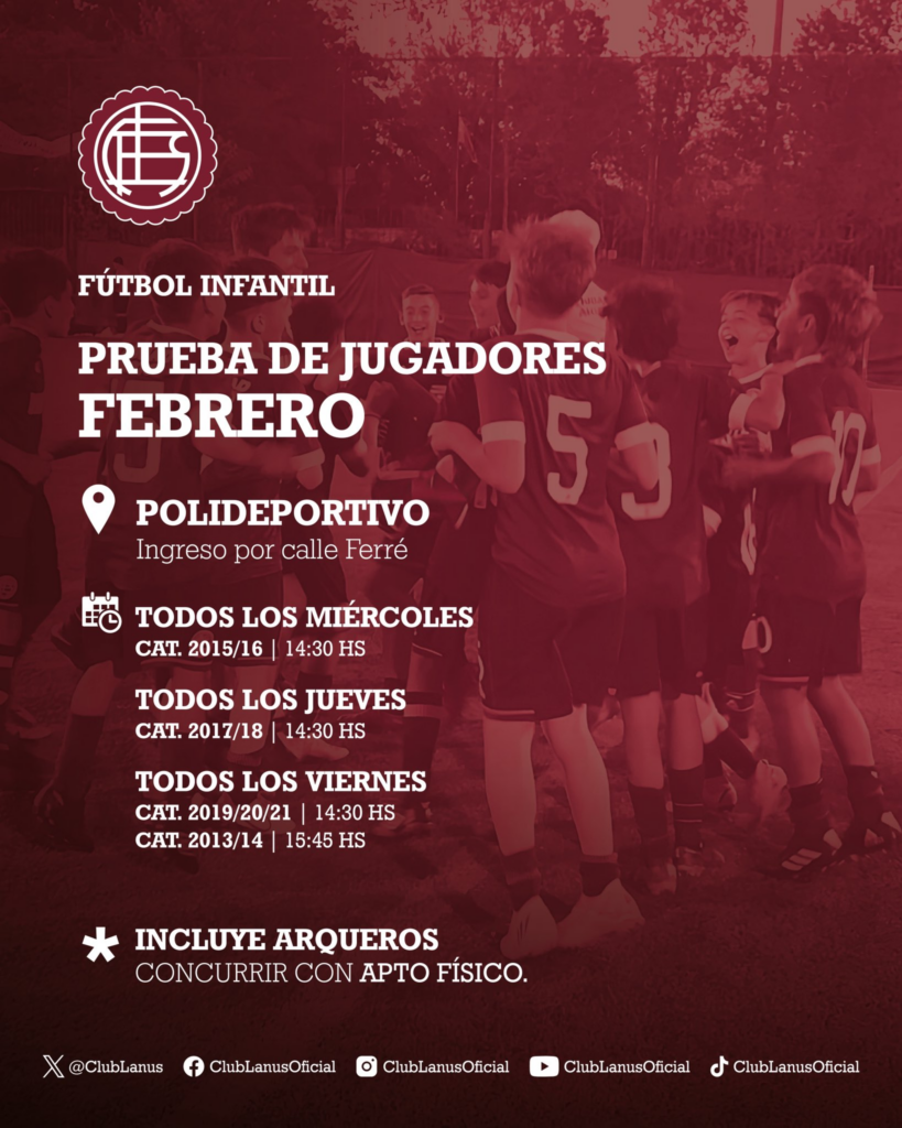 El Club Atlético Lanús abrió su convocatoria para la prueba de jugadores de Fútbol Infantil, que se desarrollará durante todo el mes de febrero en el Polideportivo del club, con ingreso por la calle Ferré. La iniciativa está destinada a chicos de distintas categorías y también incluye arqueros, quienes deberán presentarse con apto físico.