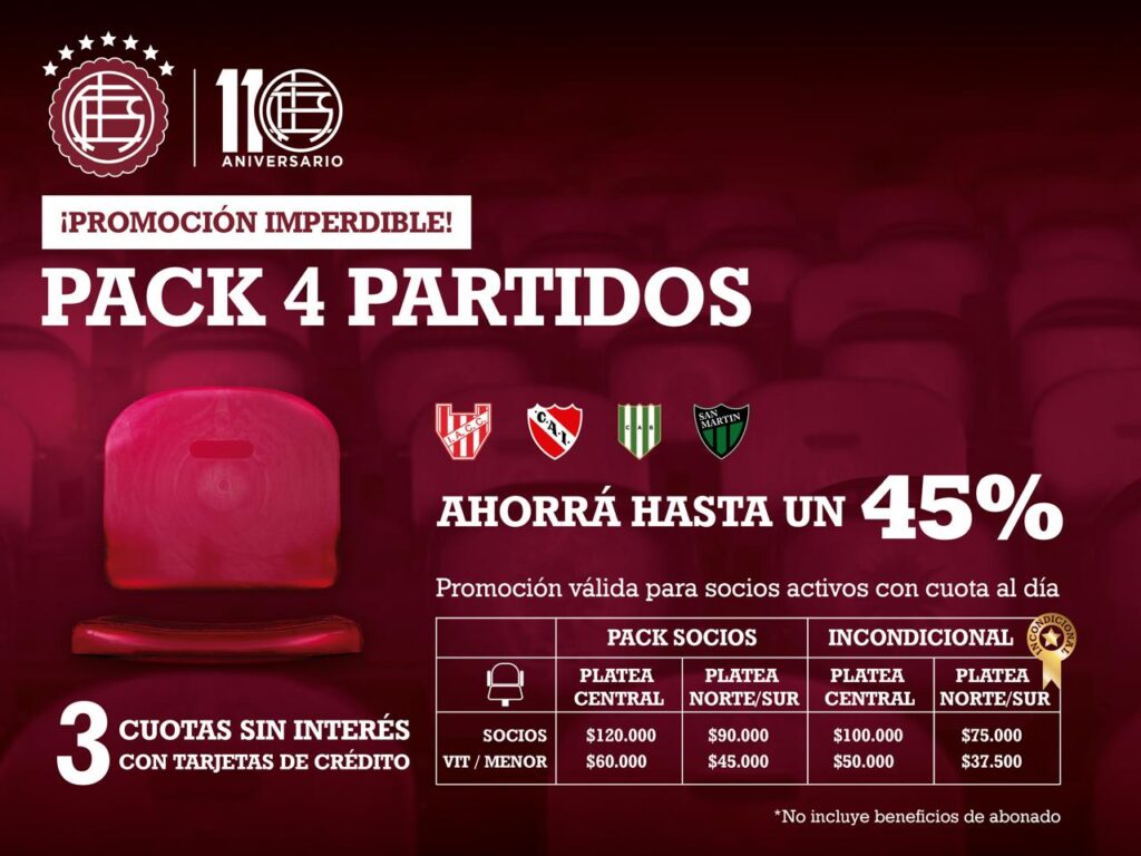 El Club Atlético Lanús informa a sus socios activos sobre una promoción exclusiva para la adquisición de un pack de cuatro partidos, con descuentos de hasta el 45% en la compra de entradas para las plateas Central, Norte o Sur.