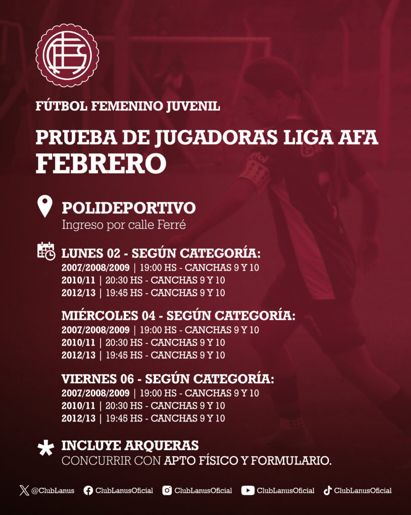 Club Atlético Lanús convoca a jugadoras interesadas en integrar las divisiones juveniles que compiten en la Asociación del Fútbol Argentino (AFA).